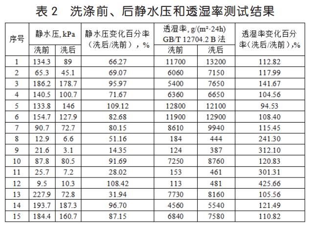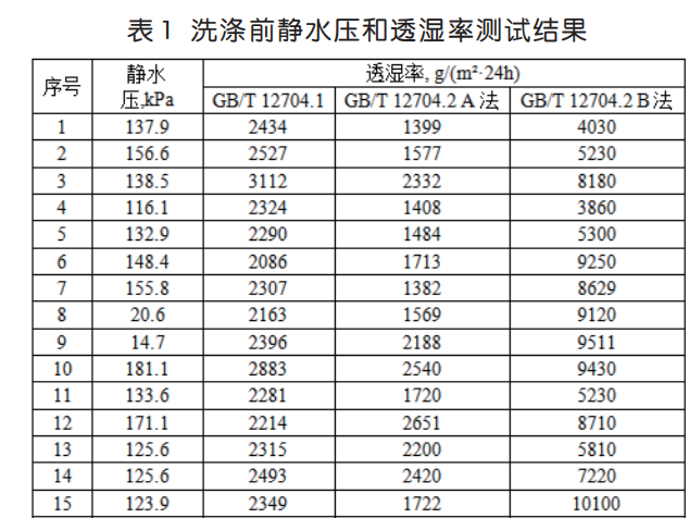 以筆者所在的檢測(cè)機(jī)構(gòu)為例,收集了一定時(shí)間內(nèi)的沖鋒衣面料檢測(cè)樣品,共計(jì) 50 個(gè),其中 35 個(gè)樣品采用上述方法,進(jìn)行靜水壓和透濕率測(cè)試,研究不同方法之間的關(guān)系,結(jié)果見表 1。15 個(gè)樣品按照GB/T 32614-2016《戶外運(yùn)動(dòng)服裝 沖鋒衣》測(cè)試比較樣品洗滌前、后的靜水壓和透濕率變化,結(jié)果見表 2。