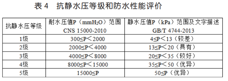可見,防水透濕面料倒杯 - 蒸發(fā)法的透濕率基本符合正態(tài)分布,≤ 4000g/(m2·24h)的比例為10.0%,> 10000g/(m2·24h)的比例 10.0%,一半以上測(cè)試結(jié)果集中在 5000~ 9000 g/(m2·24h)。而靜水壓測(cè)試結(jié)果相對(duì)比較分散,≤ 30kPa 的比例為 16.0%,> 170kPa 的比例為 12.0%,70% 以上的測(cè)試結(jié)果大于 70kPa。以 GB/T 32614-2016《戶外運(yùn)動(dòng)服裝 沖鋒衣》中對(duì)沖鋒衣面料 I 級(jí)功能性要求而言,即洗滌前透濕率≥ 5000g/(m2·24h),靜 水 壓 ≥ 50kPa,50 塊 面 料 透 濕 率 合 格 率 為84.0%,靜水壓合格率為 82.0%,合格率基本一致。但靜水壓指標(biāo)相對(duì)更好,三分之二的樣品靜水壓> 100kPa,遠(yuǎn)遠(yuǎn)滿足標(biāo)準(zhǔn)要求,這也驗(yàn)證了靜水壓指標(biāo)通過(guò)在織物表面的涂層處理很容易符合標(biāo)準(zhǔn)要求。將 GB/T 4744-2013《紡織品 防水性能的檢測(cè)和評(píng)價(jià) 靜水壓法》及臺(tái)灣標(biāo)準(zhǔn) CNS 15000-2010《防水透濕紡織品性能評(píng)估》[8] 對(duì)靜水壓的評(píng)價(jià)性能列如表 4 所示。