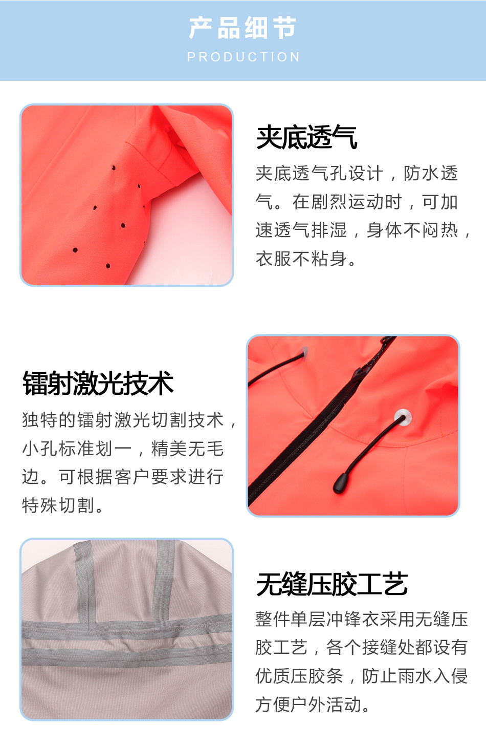 無縫壓膠工藝:整件單層壓膠沖鋒衣采用無縫壓膠工藝,各個接縫處都設有優質壓膠條,防止雨水入侵方便戶外活動。