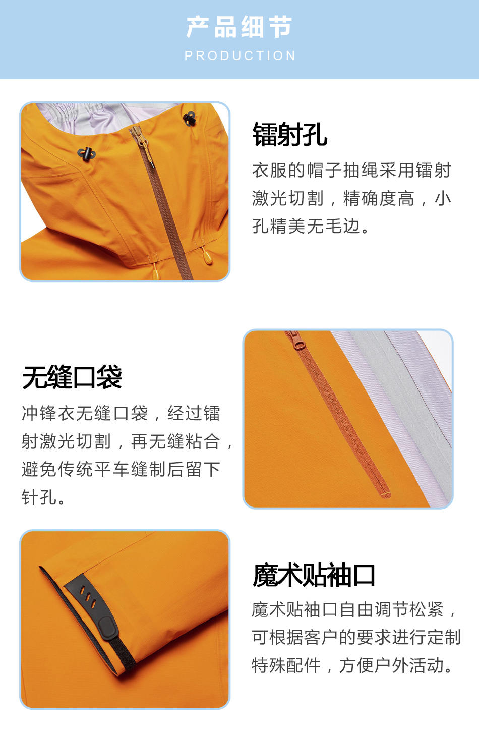 鐳射孔:鐳射無縫沖鋒衣的帽子抽繩采用鐳射激光切割,精確度高,小孔精美無毛邊。