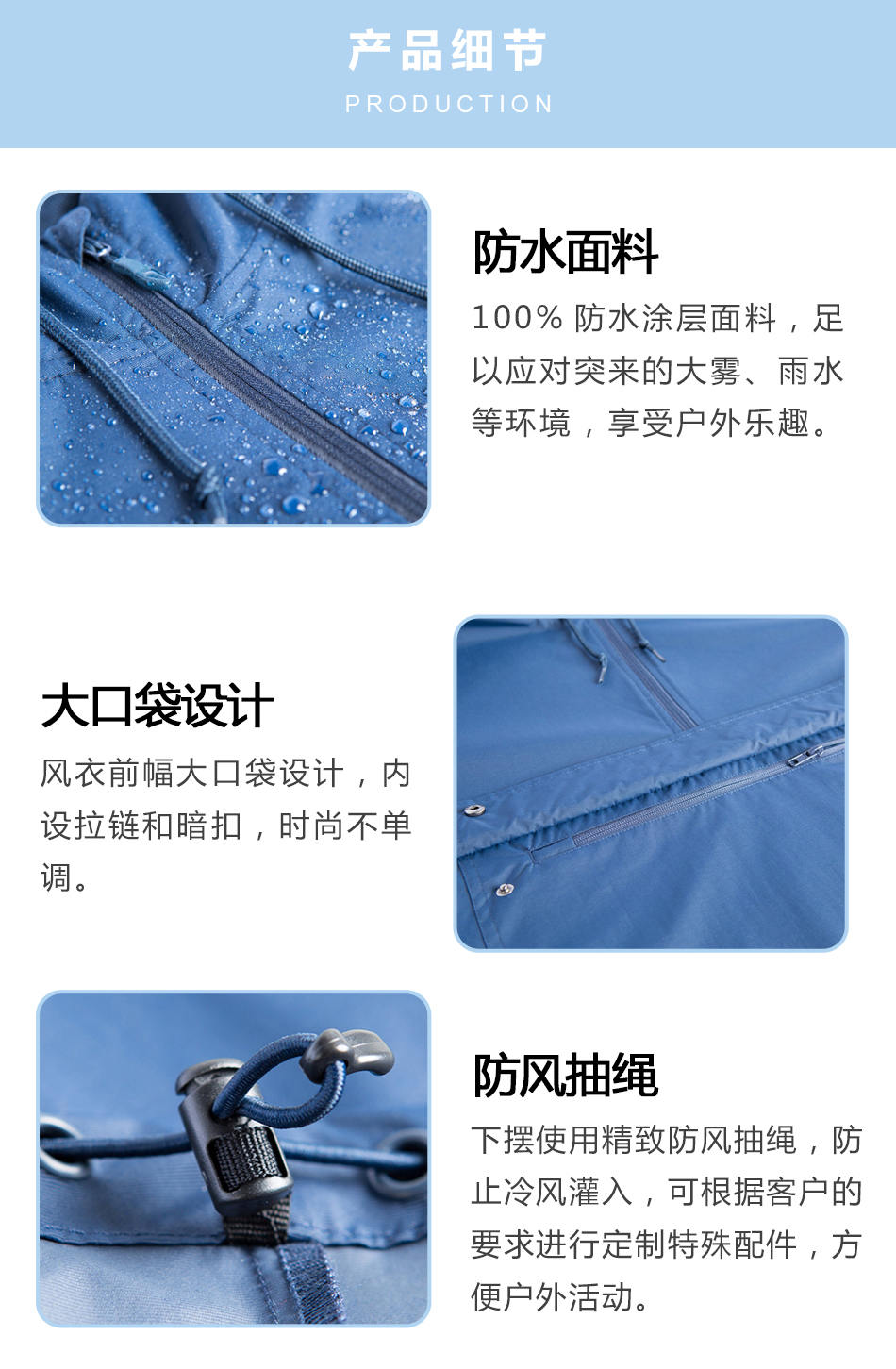 • 防風抽繩:下擺使用精致防風抽繩,防止冷風灌入,可根據客戶的要求進行定制特殊配件,方便戶外活動。
