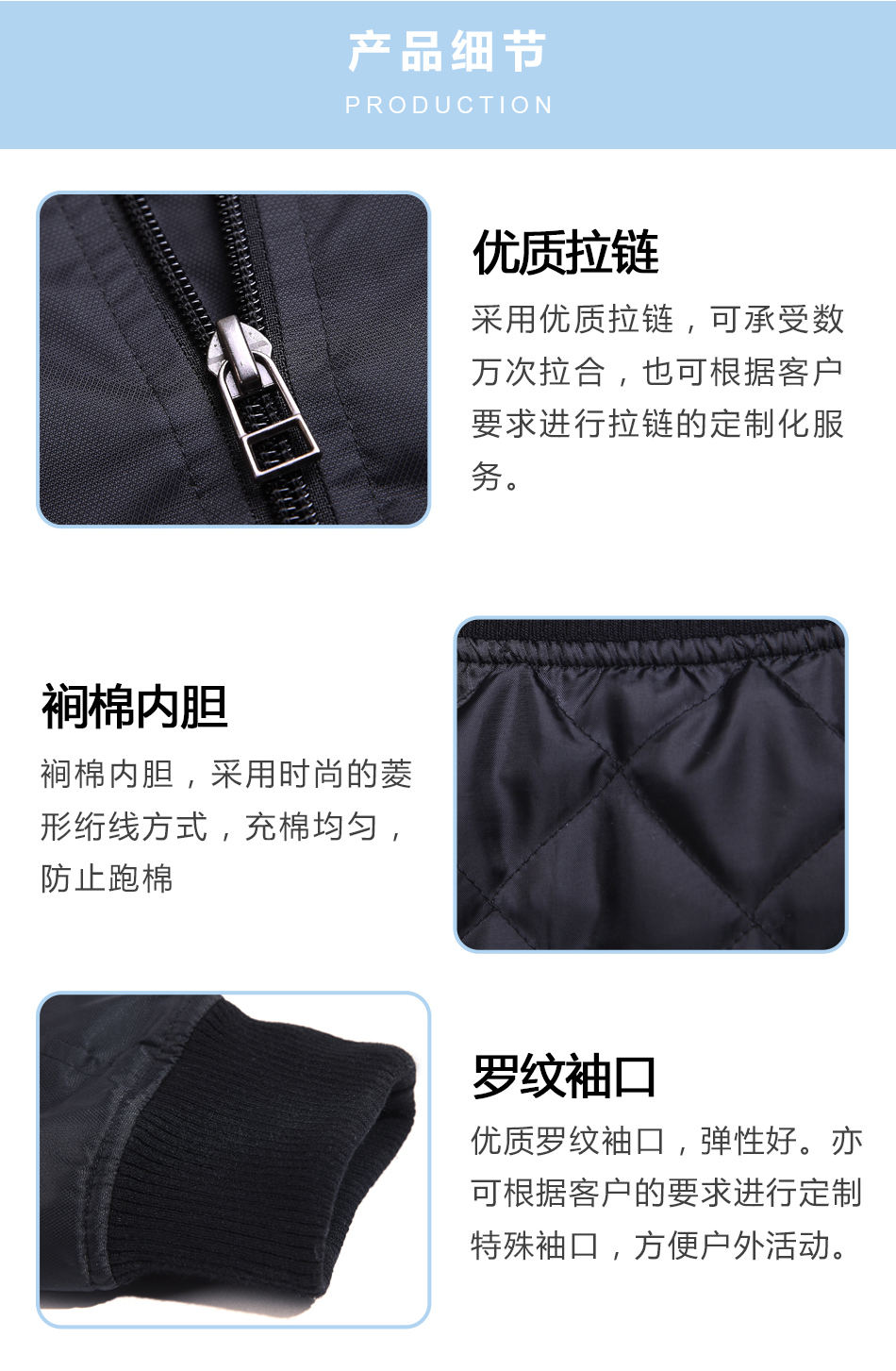 羅紋袖口:優(yōu)質(zhì)羅紋袖口,彈性好。亦可根據(jù)客戶的要求進(jìn)行團(tuán)體夾克定制其特殊袖口,方便戶外活動。