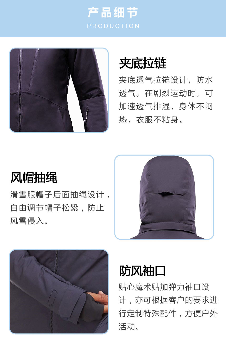 風帽抽繩:防水滑雪服定制出的帽子后面抽繩設計,自由調節帽子松緊,防止風雪侵入。