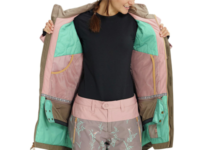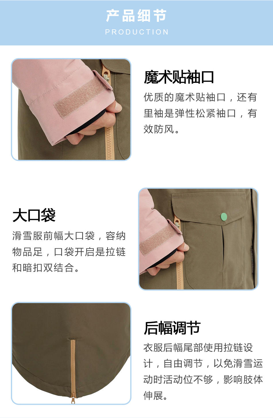 大口袋:滑雪服前幅大口袋,容納物品足,口袋開(kāi)啟是拉鏈和暗扣雙結(jié)合。